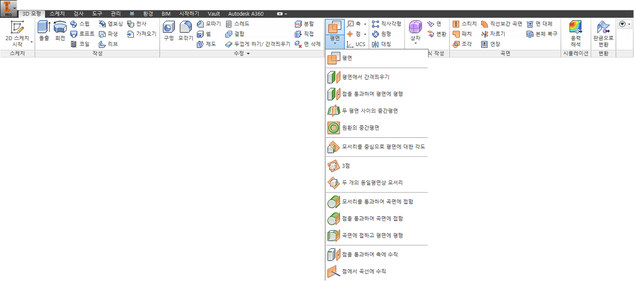 [3D 모형] 탭 - [작업 피쳐] 패널 - [평면] - [평면에서 간격띄우기] 도구를 선택한다.