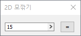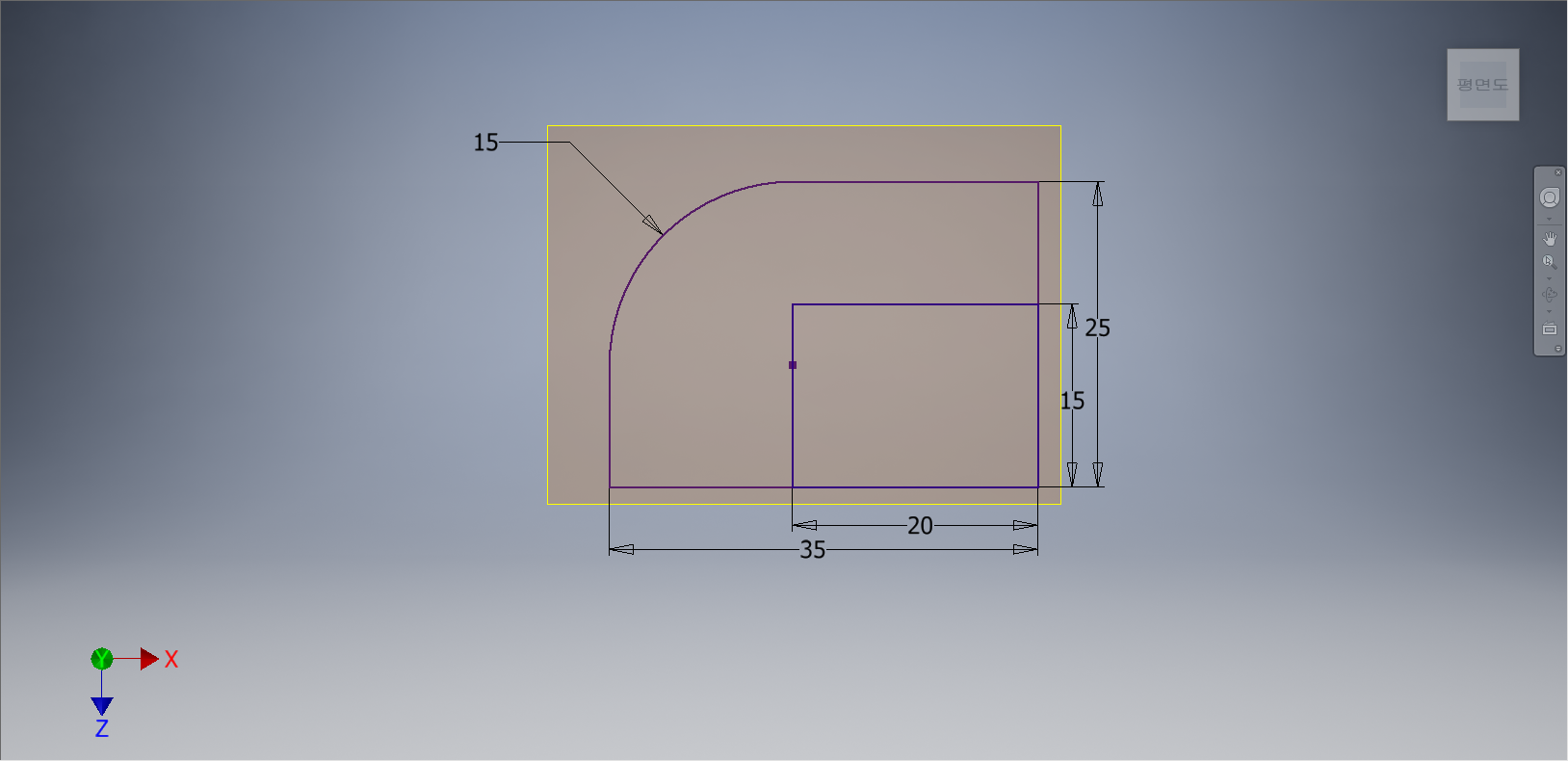 [2D 모깎기] 대화상자가 나타나면 반지름값을 15mm로 입력해주고 오른쪽 아랫부분의 모서리를 클릭해 준다. 모깎기 형상이 나타나면 대화상자의 닫기 버튼을 클릭해 준다.