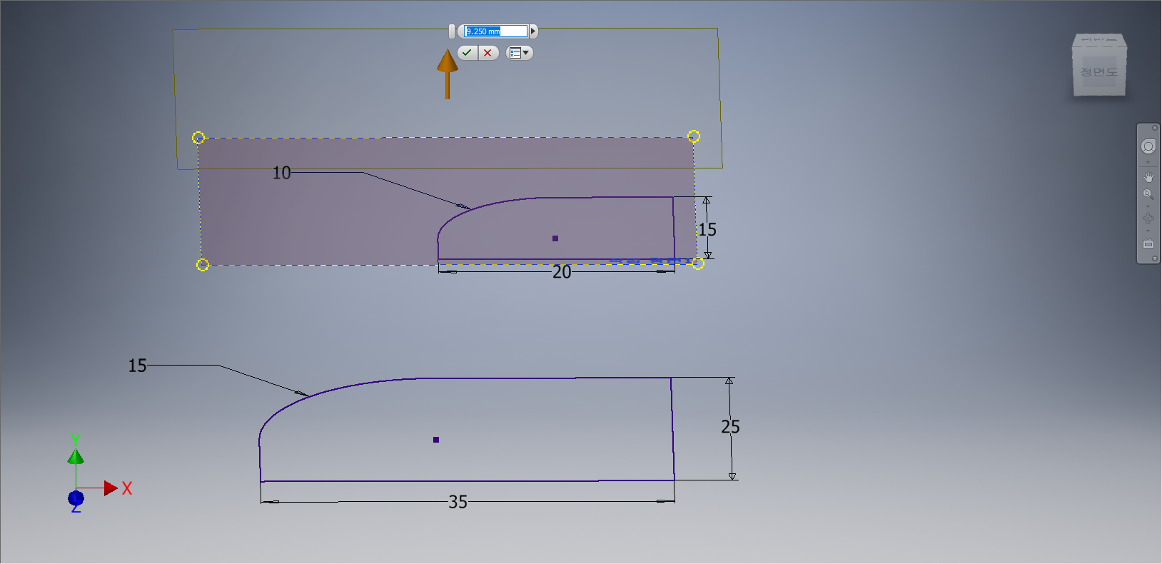 [작업평면2]의 외곽선을 마우스 왼쪽 버튼으로 드래그하여 화면의 윗쪽으로 이동시켜 준다. 치수입력창에 15mm를 입력하고 확인단추를 클릭한다.