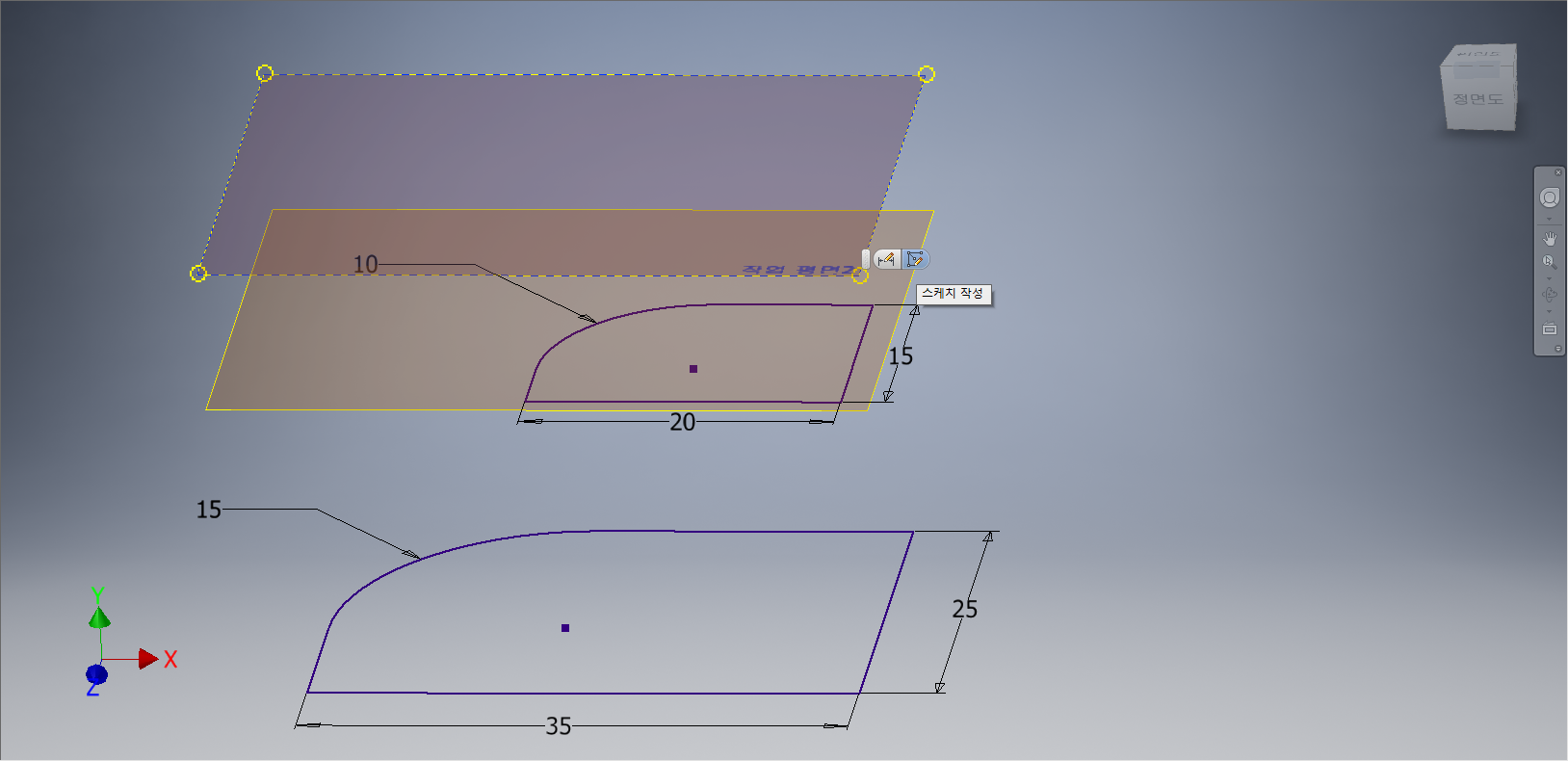 [작업평면2]를 클릭한다. 도구모음 중에서 [스케치 작성]을 선택한다. 여기서 [작업평면1]과 [작업평면2]가 변경이 되는데 기존에 현재의 [작업평면2]를 추가하기 전에 [작업평면1]이 맨처음 스케치를 작성한 작업평면이었고 [작업평면2]가 두번째로 스케치를 작성한 작업평면이었다. 새로운 작업평면을 추가함으로써 기존의 [작업평면2]가 [작업평면1]로 변경됨과 동시에 새로운 작업평면이 추가되는 것이다.